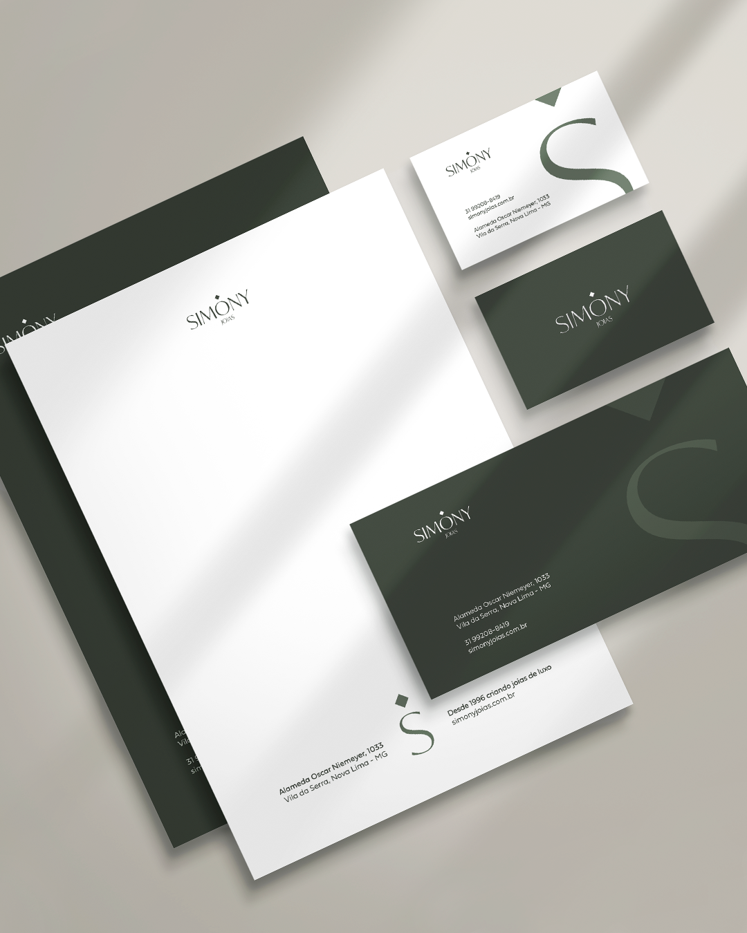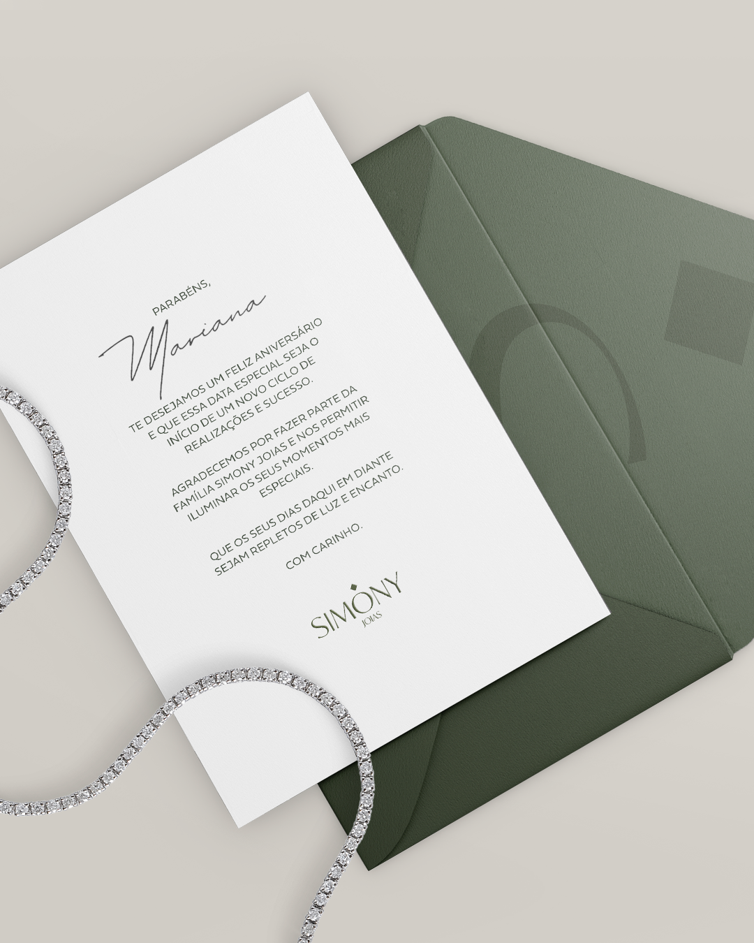 Além da presença digital, também desenvolvi peças de papelaria para a Simony Joias, como envelopes comerciais e para mensagens personalizadas aos clientes, fortalecendo a identidade visual da marca em cada detalhe. Esse trabalho contribuiu para reforçar o relacionamento da marca com seus consumidores, oferecendo uma experiência de luxo tanto no ambiente online quanto nas interações físicas.